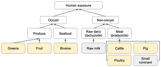 T. gondii foodborne exposure is broadly divided into two categories, non-oocyst and oocyst-borne (Figure 1). For foods contaminated with parasite stages that are not oocysts, we distinguish between meat-borne bradyzoite cyst infection from beef, pork, poultry, or ovine/caprine meat, and tachyzoite infections from unpasteurized dairy products. Oocyst-borne infections can result from the consumption of contaminated produce (fruits and vegetables), seafood (fish and/or shellfish), or water. Our study focused on the foodborne route to tease out food preferences that can be targeted for mitigating foodborne disease and thus did not include water as a potential source of exposure. Infections due to tachyzoites in raw dairy and bradyzoites from small ruminants were excluded from analysis due to the lack of dose–response and consumption data, respectively.