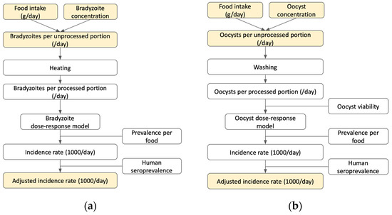 The stochastic Bayesian QRA that we applied for characterizing the risk of T. gondii exposure consists of four distinct steps: (1) hazard identification (Figure 1), (2) exposure assessment, (3) dose–response, and (4) characterization of risk from each transmission pathway (oocyst or bradyzoite) repeated for each food type (Figure 2). The final outcome of the model was an adjusted incidence rate per 1000 people per day, which accounts for immunity among Brazilians previously exposed to T. gondii. Given limited data on T. gondii across the various food matrices tested, a Bayesian risk assessment approach was selected to evaluate the probability of oocyst and bradyzoite T. gondii transmission in Brazil. Sensitivity and scenario analysis were also performed to evaluate a range of possible outcomes given different initial assumptions. All analyses were performed in R using the ‘rjags’ package [27] to interface between R and JAGS, a clone of BUGS (Bayesian analysis Using Gibbs Sampling). This framework can be adapted for future use when more data on regional and food-specific T. gondii prevalence are generated.