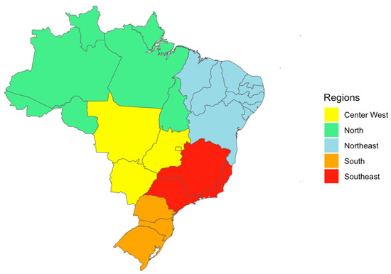 Data on average daily consumption of specific foods that were included in our study were obtained from the 2017–2018 edition of Pesquisa de Orçamentos Familiares (POF, Family Budget Research) [28], which is administered by the Brazilian Institute of Geography and Statistics (IBGE). The data (mean grams consumed/day) focus on a subset of the Brazilian population aged 10 years and older and encompasses differences in urban and rural areas across all Brazilian states. The twenty-six states and one federal district are commonly grouped into five regions based on geographic, social, and economic factors as used by the IBG:; north, northeast, center-west, southeast, and south (Figure 3).