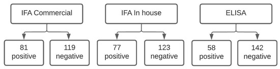The proportion of positive samples obtained with in-house IFA and ELISA was lower than that obtained with commercial IFA, but the difference was not statistically significant between the techniques. The IFA showed similar results, but in general, the commercial IFA test was slightly more sensitive than the in-house IFA. The ELISA showed different sensitivity results than the commercial IFA, with a much lower sensitivity.