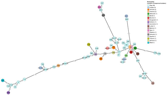 A minimum spanning tree of 58 L. pneumophila isolates from water samples taken in apartment buildings in Latvia, based on cgMLST. The node sizes are proportional to the numbers of isolates sharing an identical pattern, while the node colors represent the geographical origin of the isolates, and the node labels indicate STs of the L. pneumophila isolates.