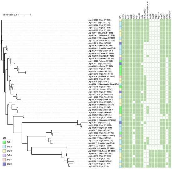 A maximum-likelihood tree built from core-gene alignment of 58 L. pneumophila strains. The municipality of the sample origin and SBT type is given in brackets after the name of each node, with strains from buildings linked to LD cases highlighted in bold. Colored squares indicate the serogroup of each isolate. The panel of green squares shows the distribution of L. pneumophila virulence and antimicrobial resistance genes among all isolates. Green-filled squares indicate the presence of the gene, while empty squares indicate the absence of the gene in the respective L. pneumophila isolate.