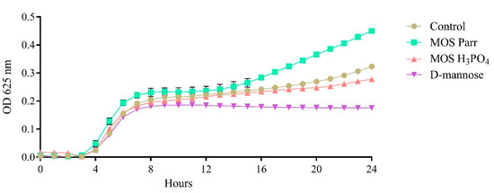 The potential antimicrobial activity of H3PO4, MOS Parr and D-mannose was assessed using a time–growth inhibition curve [31]. A solution of each sample in the growth medium Mueller Hinton (MH) (Biokar Diagnostic, Beauvais, France) was prepared to a final concentration of non-cytotoxic mannose concentration (2.5 mg/mL). Mannose content of each sample was previously determined using GC-FID. MOS H3PO4 and MOS Parr extracts were diluted in MH medium and sterilized using a sterile 0.22 µm filter (Millipore, Billerica, MA, USA). D-mannose was dissolved in PBS solution to a final concentration 2-fold higher than the desired one and sterilized using the autoclave (Prohs, Porto, Portugal) at 100 °C for 20 min. After sterilization, D-mannose solution was twofold diluted in MH medium to achieve a final concentration, in mannose, of 2.5 mg/mL. The UPEC strain was used as a monoculture and before the assay was grown in Tryptic Soy Agar (TSA; Biokar Diagnostic, Beauvais, France) with 3 g/L of yeast extract (Sigma-Aldrich, Munich, Germany) at 37 °C for 24 h under aerobic conditions. Afterwards, one colony was picked, resuspended in 10 mL of MH broth, and grown at 37 °C for 24 h under aerobic conditions. The bacteria inoculum was adjusted to an optical density (OD) at 625 nm of 0.1–0.08 (cell density of 1 × 108 cells/mL, corresponding to 1.5 × 107 CFU/mL) and 10 times diluted to obtain the work inoculum. To evaluate bacterial growth inhibition, 980 µL of each sample was transferred to a sterile microtube and inoculated with 20 µL of the work UPEC inoculum. After mixing by vortexing, 200 µL of the suspensions was transferred to a 96-well microtiter plate (Nunc, Darmstadt, Germany) and the OD at 625 nm was assessed for a 24 h period at 37 °C (1 h intervals) using a microplate reader (Epoch, VT, USA) with the increase in OD values being considered a consequence of bacterial growth. A positive control was drawn using inoculated MH medium without antimicrobial agent and sterile MH medium was used as a negative control. Blanks of the samples were used to correct sample color OD interference.