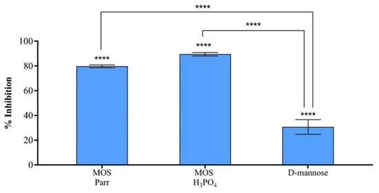 To assess the adhesion inhibition of the MOS extracts, HTB-9 cells were simultaneously exposed to the samples and to a UPEC suspension. As can be seen in Figure 4, the adhesion inhibition values obtained for MOS H3PO4 (89.6 ± 1.4%), MOS Parr (79.8 ± 1.1%) and D-mannose (30.7 ± 5.9%) are significantly higher (p < 0.001) than those obtained for the control, demonstrating that all samples inhibited UPEC’s adhesion to HTB-9 cells. Furthermore, it was possible to observe that although no significant difference in bacterial adhesion was found between MOS H3PO4 and MOS Parr (p > 0.05), both extracts display a higher adhesion inhibition effectiveness than D-mannose (p < 0.001).