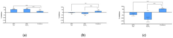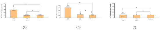 Percentage (%) of adhesion inhibition of UPEC to HTB-9 after 1 h (a), 2 h (b) and 3 h (c) of HTB-9 incubation with MOS H3PO4, MOS Parr and D-mannose. Bars represent means ± SD. * p < 0.05, ** p < 0.01, *** p < 0.001 and **** p < 0.0001 indicate statistically significant differences between the MOS extracts and D-mannose and between the different samples and the control (ns—non-significant). Results are expressed in relation to the control (HTB-9 cells in RPMI and infected with UPEC, used as reference for 100% survival).
