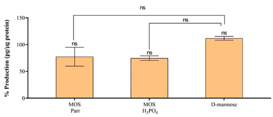 The expression of IL-6 is depicted in Figure 3, revealing a tendency for increased IL-6 production by HTB-9 cells with longer incubation periods. Significant differences in cytokine expression were observed after 3 h of incubation with HTB-9 cells for MOS Parr (p < 0.0001), H3PO4 (p < 0.01), and D-mannose (p < 0.001). Except for specific time points, such as MOS Parr 1 h and 3 h, MOS H3PO4 1 h, and D-mannose 3 h (p < 0.01), no significant differences (p > 0.05) were observed between the samples and their controls. Moreover, except for MOS H3PO4 after 2 h of incubation (p < 0.01), no significant differences in IL-6 production levels were found between the extracts and D-mannose (p > 0.05). MOS has been commercially available as a feed additive and, therefore, information reported regarding its immunomodulatory effect in humans is, to our knowledge, non-existent.