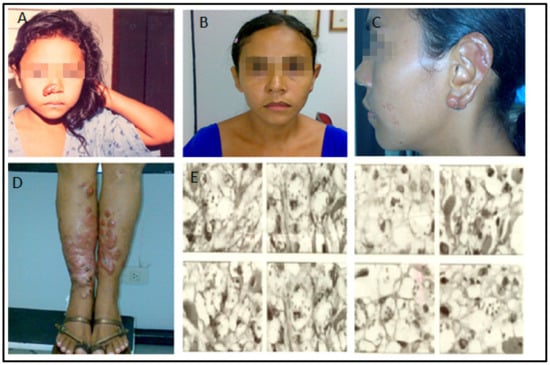 - Christensen, S.M.; Belew, A.T.; El-Sayed, N.M.; Tafuri, W.L.; Silveira, F.T.; Mosser, D.M. Host and parasite responses in human diffuse cutaneous leishmaniasis caused by L. amazonensis. PLoS Negl. Trop. Dis. 2019, 13, e0007152. [Google Scholar] [CrossRef]