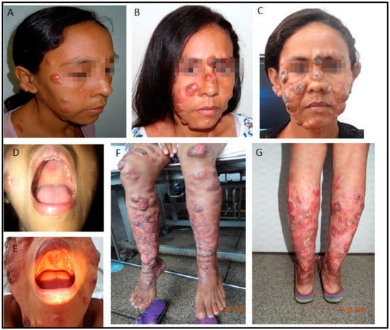 (A–C): Disfiguring ulcerative facial nodules (January 2011, October 2011, May 2012), 3 months, 12 months, and 1 month after delivery. (D,E): Mucosal palate involvement (2011, 2012). (F,G): Extensive lesions on the extremities in 2012, shortly before treatment with miltefosine and liposomal amphotericin B. Note the impressive worsening of lesions involving the face, extremities, and soft palate.