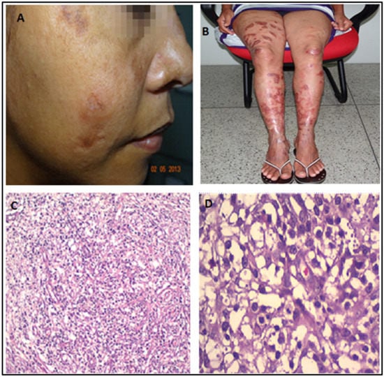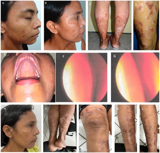 The case presented here is typical of DCL, which usually begins in childhood and is clinically characterized by skin-colored or erythematous papules, plaques, or nodules. Unlike LCL, ulceration usually does not occur. The disease evolves with the appearance of other similar lesions in the surrounding skin. Over months to years, hematogenous dissemination of the parasite occurs with other lesions’ appearance in various body parts. As with the patient, the most affected areas are the face and limbs, and the disease spares the scalp, armpits, and inguinocrural and palmoplantar regions. Infiltration may involve large areas of the body and, when present on the face, give the patient the leonine appearance, confounding with Virchow’s leprosy, like this lady [4,5,6].