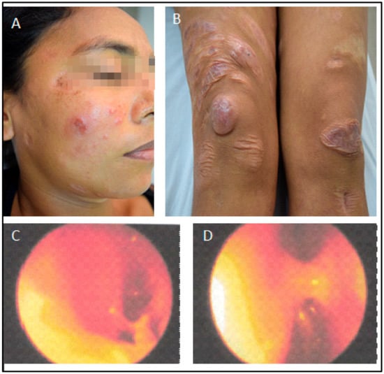 Skin and nasal situation before treatment with intranasal pentavalent antimonial (January 2015). (A,B). Papules in the face and nodules in the knees. Rhinoscopy. (C). Left nasal cavity. (D). Right nasal cavity showing nasal septum hyperemia with abundant purulent discharge.