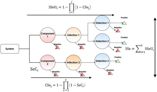 Following the calculation of surveillance system branches, aggregation of all SSeUi values allows for the calculation of the overall surveillance system sensitivity. This process follows the calculation outlined in Equation (3):