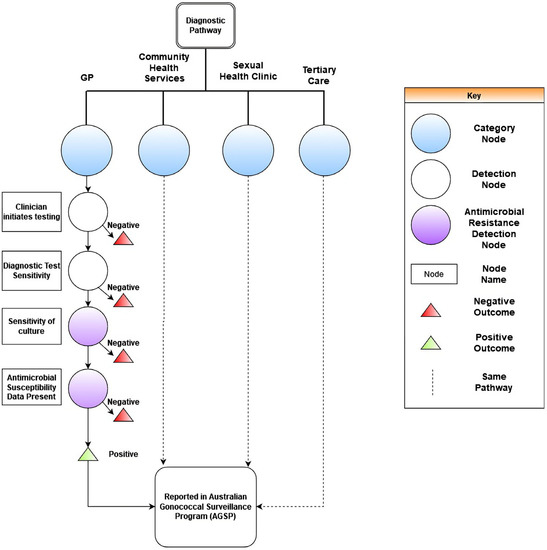 There were four distinct category nodes that encompassed thematically grouped branches by the intricacies of N. gonorrhoeae infection. The category identified the stratification of infected individuals by biological sex and clinical symptom status. This grouping considers the differential risk factors of sex and whether an individual is symptomatic. The second category is based on the differential risk of health-seeking behaviours of infected individuals. The dividing factor of health-seeking behaviour was contingent on an individual’s sex. The third category identifies the differential risk of initiating clinical testing. The dependencies of this node were biological sex of the individual and the respective healthcare setting. The final division identified convergence of all pathways through diagnostic laboratory testing to confirm the presence of N. gonorrhoeae and determine antibiotic resistance with antibiotic susceptibility data.