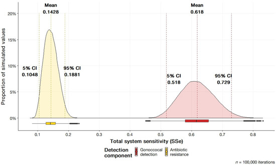 The STM simulation results for the AGSP in detecting N. gonorrhoeae and antibiotic resistance can be seen in Table 2. The complete model in R can be examined in the Supplementary File S2. The distributions for the simulations with 95% confidence intervals are depicted in Figure 4. Sensitivity explicitly refers to the expected proportion of infected individuals captured by the surveillance system. The parameter space for sensitivity is between 0 and 1, denoting the percentage infected individuals detected. The results of the STM in the surveillance system has demonstrated the AGSP was sensitive to the detection N. gonorrhoeae at an expected sensitivity of 0.624 (95% CI; 0.524, 0.736). The sensitivity value was greater than the mean sensitivity of the antibiotic resistance surveillance system, which was 0.144 (95% CI; 0.106, 0.189). For gonococcal detection, the system was observed to produce the greatest maximum of 0.848. The lowest sensitivity observed was the minimum of antibiotic resistance at 0.08. The range of values observed in the detection of N. gonorrhoeae imply the system is expected to capture approximately 62.4% of the infected population, with the confidence interval also supporting the potential for detection to be between 52.4% and 73.6% of the true population. Furthermore, in the context of ascertaining antibiotic resistance, the model anticipates 14.4% of the infected individuals to have their susceptibility status identified and reported to the surveillance system. The confidence interval produced supports the range to be between 10.6% and 18.9%. The two distributions differ by the inclusion of the antibiotic resistance detection parameters, antimicrobial susceptibility (AST) data, and sensitivity of culture. The effect of the parameters caused the narrowing of the distributions resulting in a smaller confidence interval.