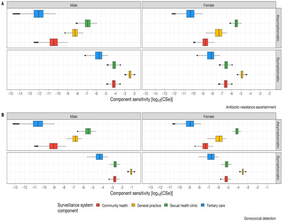 Sub−system component sensitivity (CSe) on a logarithmic scale. (A) depicts the component sensitivities by sex, symptom status, and health service for the determination of antibiotic resistance. (B) Depicts the component sensitivities for gonococcal detection by sex, symptom status, and health service.