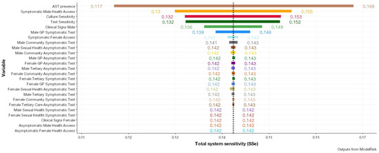 The full sensitivity analyses as produced by ModelRisk (VoseSoftware version 6.1.94) can be viewed in the Supplementary File S2. The sensitivity analysis depicting the influence of each parameter on the sensitivity value in the overall model can be seen in Figure 6. Among the evaluated parameters, the presence of AST data as a model parameter has emerged as the most influential factor in ascertaining antibiotic resistance status. Increasing the variable to the maximum specified value had the most pronounced effect on system sensitivity. This was followed by symptomatic male healthcare access and laboratory diagnostics such as culture and diagnostic test sensitivity. Parameters concerning males were observed to exert a greater influence on the overall system sensitivity as compared to parameters concerning females. As a generalisable trend, parameters pertaining to females exerted a near negligible effect on the overall system sensitivity for antibiotic resistance.