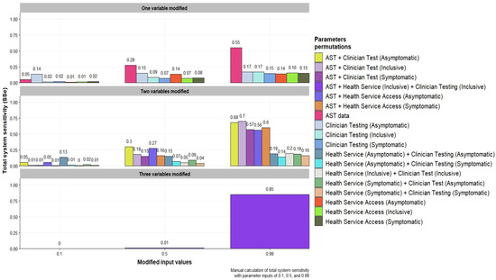 ModelRisk’s sensitivity analysis identified AST, health service access, and clinician testing as influential parameters for modification due to their influence of surveillance system sensitivity when modified. Figure 7 illustrates the result of modifying identified parameters at 0.1, 0.5, and 0.99 in various permutations to simulate both detrimental and supplemental activity to increase influence. Supplementary File S2 presents the raw results of input parameter modification at values of 0.1, 0.5, and 0.99 for overall system sensitivity. Notably, the greatest increase in overall system sensitivity was observed when the parameters of AST, health service access for symptomatic and asymptomatic patients, and clinician testing were set to 0.99. The findings suggest that, given all asymptomatic and symptomatic patients were screened with AST testing completed, it would be expected that 85% of the infected population would have their resistance status ascertained. Conversely, modification of parameters at values of 0.1 significantly lowered overall system sensitivity. Computing system sensitivity with values of the AST parameter set at 0.5, and 0.99 was observed to result in the greatest increase caused by a single parameter. An increase in system sensitivity for antibiotic resistance detection was observed when modifying AST data in any permutation from the values of 0.5 and above. Non-significant impacts on overall system sensitivity were observed in joint modifications of health service access and clinician testing.