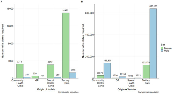 Demonstration of the estimated number of isolates required for antibiotic susceptibility testing for absolute certainty in exotic serotype detection using component sensitivity (CSe) and calculated by . (A) Contains the symptomatic male and female component sensitivities by healthcare setting. (B) Contains the asymptomatic male and female component sensitivities by healthcare setting.