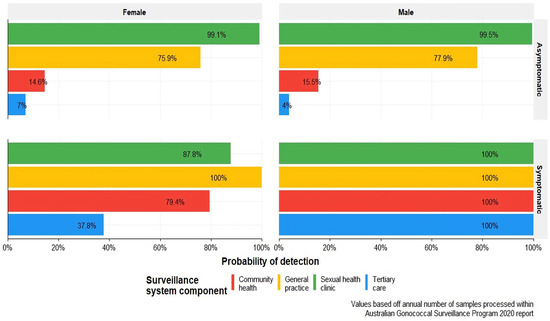 An interesting result revealed by the system sub-component sensitivities is the presence of biased sampling. The observed trend of higher sensitivities in diagnostic components related to males, as compared to females, and in symptomatic individuals, as compared to asymptomatic individuals, can be interpreted as greater proportions being detected through these pathways. This would indicate that sampling for isolates would inherently present greater probability for the sample to originate from a symptomatic male. For detection of N. gonorrhoeae infection, this result is in line with broader epidemiological literature suggesting greater prevalence amongst men [27,28]. However, there are concessions to be made regarding the probability of resistance susceptibility. In the discussion of antibiotic resistance, there is a growing body of literature which may suggest gender influences an individual’s susceptibility to resistance [29,30,31]. Thus, there is an argument to acknowledge the bias presented. Enhancement of the epidemiological understanding can be conducted by utilising supplementary systems to the surveillance structure such as surveys. However, there is a clear need for additional research to delineate pragmatic benefits in implementing these systems.