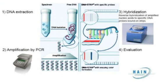 HAIN genotype line probe assay (LPA) (https://media.tghn.org/medialibrary/2020/09/Hain_GenoType_Line_Probe_Assay_Pacome_Abdul.pdf, accessed on 21 June 2023).