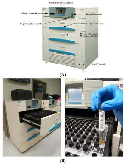 (A) The BACTEC™ MGIT™ 960 instrument (Becton Dickinson) and culture tubes for broth-based mycobacterial growth: https://ntep.in/node/1464/CP-mgit-960-instrument-parts (accessed on 21 June 2023); (B) The BACTEC™ MGIT™ 960 instrument (Becton Dickinson) and culture tubes for broth-based mycobacterial growth: https://www.researchgate.net/figure/The-BACTEC-MGIT-960-instrument-Becton-Dickinson-and-culture-tubes-for-broth-based_fig2_303560156 (accessed on 21 June 2023).