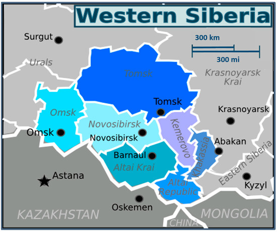 Geographical position of Barnaul and Altai Krai, Western Siberia (modified from https://commons.wikimedia.org/wiki/File:Western_Siberia_WV_map_PNG.png; accessed on 3 July 2023).