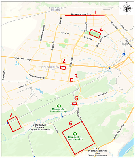 The map of tick collection zones in Barnaul. Zones for tick collection with geographic coordinates: urban ecosystem with grass plantations (1 [53°23′12.0′′ N 83°42′57.7′′ E], 2 [53°20′27.3′′ N 83°41′07.4′′ E]), urban ecosystem near buildings next to coniferous forest (3 [53°19′40.1′′ N 83°41′39.0′′ E]), urban forest park area (4 [53°22′10.0′′ N 83°43′15.8′′ E]), boundary between aquatic and forest ecosystems (5 [53°18′26.7′′ N 83°41′59.1′′ E]), boundary between urban and forest ecosystems (6 [53°16′32.1′′ N 83°42′15.4′′ E], 7 [53°17′16.4′′ N 83°37′34.9′′ E]).