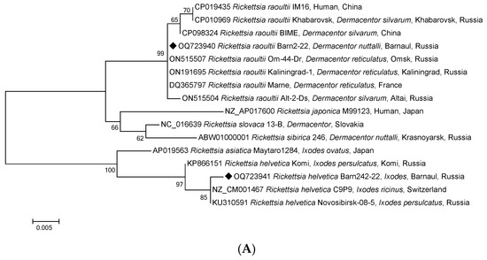 Notably, DNA samples of Rickettsia isolated from three Ixodes spp. ticks, amplified and sequenced by fragments of the gltA gene, showed the highest identity with the homologous gene of strain R. helvetica C9P9 (99.74%) (Figure 3A) and the fragments of ompB, htrA, and 16S rRNA (Figure 4A–C). As shown in Figure 4A–C, R. helvetica was 100% identical to R. helvetica C9P9 for htrA and 16S RNA gene fragments and 99.77% homologous to the ompB gene. Similar to some SFGR species, R. helvetica also lacks the ompA gene.