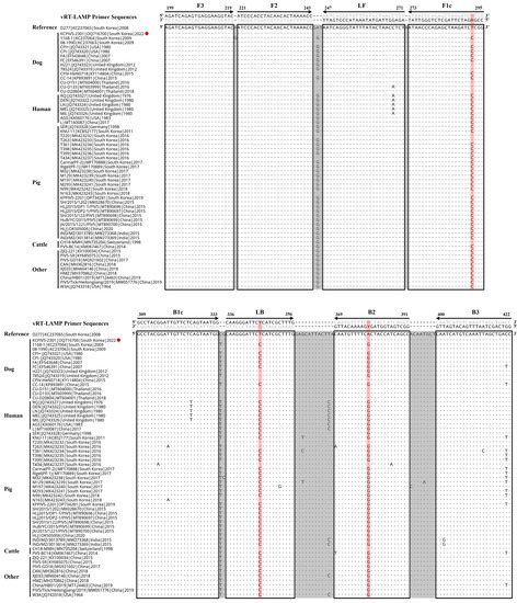 To detect a broad spectrum of PIV5 strains from different hosts [3,31] using the vRT-LAMP assay, the N gene sequences of 59 PIV5 strains (15 canine, 7 human, 26 swine, and 11 other host strains) were retrieved from the GenBank database of the National Center for Biotechnology Information (NCBI). Conserved nucleotide sequences within the N gene were identified by conducting multiple alignments using the BioEdit Sequence Alignment Editor program (https://www.mbio.ncsu.edu/BioEdit/bioedit.html, accessed on 7 March 2023). With these conserved sequences, a set of six primers for the vRT-LAMP assay, including two outer primers (F3 and B3), two inner primers (FIP and BIP), and two loop primers (LF and LB), was manually designed using Primer Explorer V5 software (Fujitsu System Solutions Ltd., Tokyo, Japan). For the variable nucleotide sites on the sequences of the F1c, LB, and B2 primers, each nucleotide was changed to a degenerated nucleotide (Y or R) to match the corresponding viral target gene sequence. Using NCBI BLAST (https://blast.ncbi.nlm.nih.gov/Blast.cgi, accessed on 15 March 2023), the specificity of the primers for vRT-LAMP was evaluated through sequence similarity searches and the primer sequences of the primers were confirmed to almost match the N gene sequences of different PIV5 strains (Figure 1). All primers were synthesized by a commercial company (BIONICS, Seoul, Republic of Korea) (Table 1).
