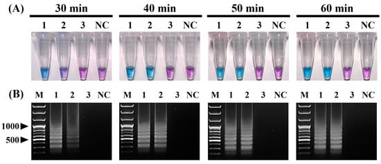 The positive color change from purple (negative reaction) to sky blue (positive reaction) of the reaction solution and the intensity of the positive sky-blue color and ladder-like DNA bands generated through the electrophoresis of the vRT-LAMP products were observed for judging the optimized reaction conditions for the vRT-LAMP assay. After the vRT-LAMP reaction with the CPIV5 N gene RNA templates (103 copies/reaction), a positive color change from purple to sky blue in the reaction tubes was observed within the temperature range from 56 °C to 66 °C (Figure 2A), and a ladder-like pattern of DNA bands was generated via gel electrophoresis (Figure 2B), indicating the successful production of stem-loop DNA with the inverted repeats of the target sequence. However, at a reaction temperature of 62 °C, the clearest color changes and electrophoretic bands were observed. Subsequently, the vRT-LAMP assay was conducted with three dilutions of the CPIV5 N gene RNA samples with different copy numbers (102, 101, and 100 copies/reaction) for different reaction times ranging from 30 to 60 min at 62 °C. Within 30 min, positive results were observed; however, the optimal reaction time, defined as the minimum time required to reach the LOD based on the clear and distinct amplicon bands observed in the reaction using 101 copies/reaction of the CPIV5 N gene RNA template, was determined to be 40 min (Figure 3A,B). These results determined the optimal reaction temperature and time for the CPIV5 vRT-LAMP assay as 62 °C and 40 min, respectively, and subsequent experiments were performed using these optimized reaction conditions.