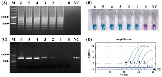 Comparison of the analytical sensitivities of the visual reverse-transcription loop-mediated isothermal amplification (vRT-LAMP), conventional reverse-transcription polymerase chain reaction (cRT-PCR), and real-time RT-PCR (qRT-PCR) assays to canine parainfluenza virus 5. (A,B) Electrophoretic analysis and visualization of the vRT-LAMP results. (C) Electrophoretic analysis of the cRT-PCR assay. (D) Amplification curves of the qRT-PCR assay. The numbers in (A–D) represent serial 10-fold dilutions of the standard canine parainfluenza virus 5 N gene RNAs (from 106 to 100 copies/reaction, lines/tubes 6–0); lane M, 100 bp plus DNA marker; tube and lane NC, negative control (nuclease-free water).