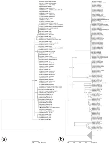 The analysis of the VP6 gene sequences from the sloth bear RVC isolates (UP-SB21 and UP-SB37) showed a significant divergence, with only 37% identity and 41.85% coverage with each other; therefore, separate analyses were conducted for each sequence. BLAST searches were performed using each sequence, and a total of 105 sequences (Supplementary Table S2, and the fasta file are provided in the Supplementary files folder) with a minimum sequence identity of 80.46% and 99% coverage with VP6 UP-SB37 were analysed. It matched different human RVC strains between 94.89–99.01% identity and pig RVC strains between 80.46–99.67% identity. Similarly, a sum of 122 sequences (Supplementary Table S3 and the fasta file are provided in the Supplementary files folder) with a minimum sequence identity of 82.13% and query coverage of 95% with VP6 UP-SB21 were found to match with different RVC strains from bovine (82.13–86.67% identity), human (84.38–83.10% identity), and pig (99.63–83.06% identity) hosts. In the present study, it was found that VP6 UP-SB37 and UP-SB21 genes were closer to pigs and humans than to bovines. It is reported in the previous studies as well that the RVC is more similar to human and porcine RVC and shares lower sequence identities with bovines and other animals. However, the bovine RVC from Japan was found to be less related to humans and porcine []. They reported 57.6–82.1% identity to humans and 56.5–82.6% to pig RVC at the nucleotide sequence level. In agreement with the present study, a report from India reported 93.9% identity of pig strain with human RVC strain []. These results suggest that sloth bears may be susceptible to RVC that are similar to those that infect humans and pigs, highlighting the potential for interspecies transmission of RVC.