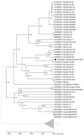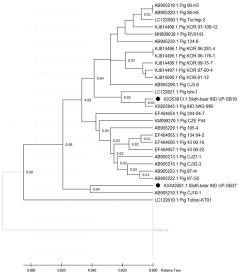 The VP7 gene sequences from the two sloth bear RVC isolates (UP-SB19 and UP-SB37) were determined and found to have 79.98% identity with 96% coverage with each other. Therefore, a combined analysis was performed for both, using VP7 UP-SB37 for searching similar sequences. A sum of 49 sequences (Supplementary Table S6 and the fasta file are provided in the Supplementary files folder) with a minimum sequence identity of 77.79% and a coverage of 96% with VP7 UP-SB37 were found to match with different RVC strains from human (77.79–77.98% identity) and pig hosts (77.85–88.40% identity) along with VP7 UP-SB21. In the previous studies, a higher percentage identity, up to 99%, has been reported in the porcine RVC VP7 gene with other porcine strains []. The RVC VP7 strain from sloth bears having a lower (88.40%) percent identity, which was the highest in this case, suggests that this strain may have undergone reassortment or was acquired from a porcine origin.