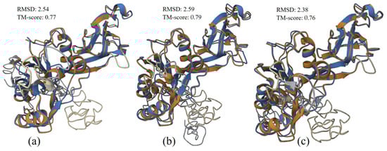 VP7 UP-SB37 protein structure (brown) aligned with proteins (blue) from human (a), UP-SB19 (b), and pig RVC isolates (c). RMSD value indicates how well the structure alignment is, and TM Score indicates the relatedness between two structures.