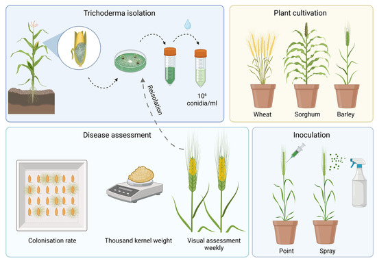 Method of pathogenicity testing with T. afroharzianum in wheat, sorghum and barley (created with Biorender.com).