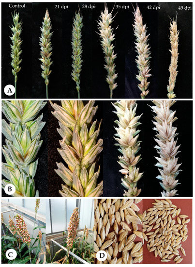 Disease symptoms in spring wheat at 21, 28, 35, 42 and 49 days post inoculation with pathogenic T. afroharzianum isolates (TriMix) (A), tan and brown discolorations at the base of a spring wheat floret at 28 days after inoculation with TriMix (B), lacking disease symptoms in inoculated sorghum varieties (C), and brownish discolorations and shriveled kernels of barley after inoculation with pathogenic TriMix at harvest (D).