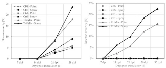 Winter barley showed first disease symptoms 21 days after point inoculation with TriMix. Infection led to 32% of disease severity at 28 dpi. No visible symptoms were observed after spray inoculation in both varieties. Neither the water-inoculated control plants nor CBS 124620-inoculated plants showed any disease symptoms after inoculation with both methods.