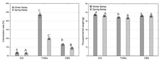 After maturity, whole ears were harvested, threshed, weighed and thousand-kernel weight (TKW) was calculated. Afterwards, one hundred kernels were placed on filter paper and the colonization rate was assessed. The colonization rate after TriMix inoculation was significantly higher in both wheat and barley varieties than water and CBS 124620-inoculated plants. The colonization rate in winter barley after TriMix inoculation was the highest (47% of infected kernels), followed by spring barley with 20% (Figure 4). Inoculation with TriMix resulted in significantly higher colonization rates, and a significant reduction in TKW in winter and spring barley compared to water and CBS-inoculated plants. Strain CBS 124620 also led to a slight colonization of kernels of winter wheat; however, it did not differ significantly from control plants. TKW was significantly reduced after TriMix inoculation in both wheat varieties in comparison to water-inoculated control plants. Both wheat varieties showed similarly high colonization rates, with 48.6% and 49.3% of infected kernels after TriMix inoculation, which was significantly higher than CBS 124620 and water-inoculated plants (Figure 5). Thousand-kernel weight was not affected by TriMix inoculation overall for both inoculation methods. However, when the two inoculation methods are considered separately, it is shown that point inoculation resulted in a significant reduction in TKW in both varieties (Table 2).