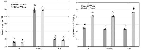 Colonization rate (%) (left) and thousand-kernel weight (g) (right) of winter and spring wheat varieties after inoculation with water (Ctrl), pathogenic TriMix and apathogenic CBS 124620 isolate (means of both inoculation methods). Different letters indicate significant differences between treatments (Tukey’s test, p ≤ 0.05). Error bars represent standard error.