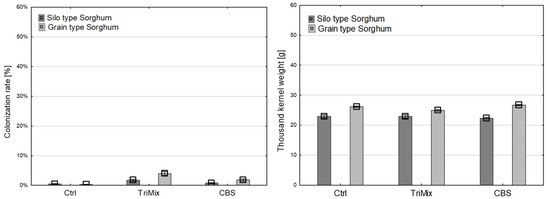 Colonization rate (%) (left) and thousand-kernel weight (g) (right) of silo type and grain type varieties of sorghum after inoculation with water (Ctrl), pathogenic TriMix and apathogenic CBS 124620 isolate (means of both inoculation methods). Error bars represent standard error.