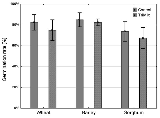 Germination rate (%) of wheat, barley and sorghum after inoculation with TriMix and water (control). Error bars represent standard error.