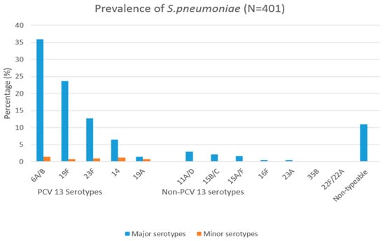 From 413 S. pneumoniae isolates, we serotyped 401 isolates, as twelve samples did not grow sufficiently upon revival. Twelve serogroups/serotypes were found. The prevalent VTs were 6A/B (144, 35.9%), 19F (95, 23.7%) and 23F (51, 12.7%). The most prevalent NVTs were 11A/D (12, 3.0%) and 15B/C (9, 2.2%). Serotypes detected together with others, i.e., minor serotypes, amounted to 21 (5.2%). PCV13 serotypes accounted for 80.3% of the serotypes amplified. Those we were unable to serotype were classified as non-typeable (n = 44, 11%), as shown in Figure 1.