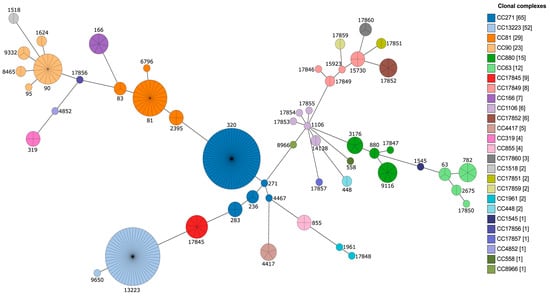The clustering of related STs was analyzed and visualized by GrapeTree software (stand-alone version), and clonal clusters (CCs) were assigned as groups sharing six identical housekeeping alleles. Profiles of international pneumococcal clones from PMEN (Pneumococcal Molecular Epidemiology Network, http://www.sph.emory.rdu/PMEN (accessed on 20 July 2022) and Global pneumococcal sequencing project, https://www.pneumogen.net/gps/pmen.html (accessed on 20 July 2022) were compared to assess the clones in the study.