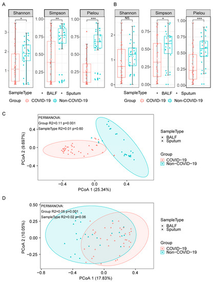 Diversities of lung microbiota in COVID-19 and non-COVID-19 patients. (A,B), α-diversity indices of bacteria (A) and fungi (B) in COVID-19 and non-COVID-19 patients. Differences between groups were analyzed using the Wilcoxon rank-sum test (*** p ≤ 0.001, ** p ≤ 0.01, * p ≤ 0.05, NS., p > 0.05). (C,D), PCoA (Principal Coordinates Analysis) based on Bray–Curtis dissimilarities for the bacterial (C) and fungal (D) β-diversity in COVID-19 and non-COVID-19. Group differences were tested by pairwise permutational multivariate analysis of variation (PERMANOVA).