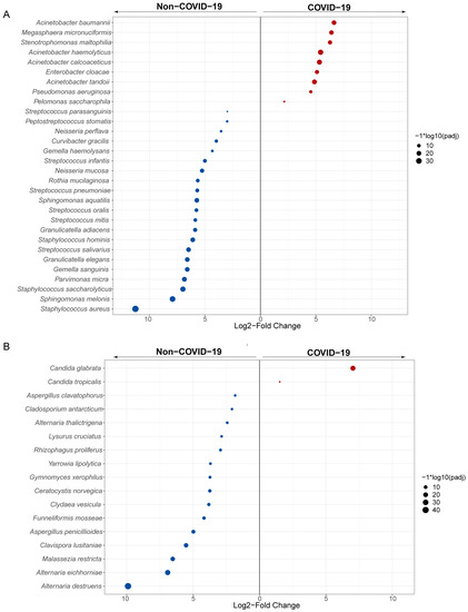 Differentially abundant species in COVID-19 and non-COVID-19 patients. Panels show taxa classified at bacterial (A) and fungal (B) species, which are differentially enriched (DESeq2, Benjamini-Hochberg Padj < 0.05, Log2FC ≥ 1.5) across the comparison between COVID-19 (red) and non-COVID-19 (blue) patients. Each point represents one taxon, scaled in size denoting −log10 (adjusted p-value).
