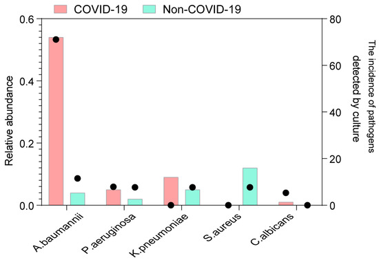 Codetection of pathogens in COVID-19 and non-COVID-19 patients. The incidence of potential pathogens in different groups. The circle shows the incidence of each pathogen by clinical microbiological culture (right y-axis), and the bar plot shows the median abundance of the pathogen in positive samples (left y-axis). The potential pathogens enriched in patients with COVID-19 are labeled in bold (Fisher’s exact test).