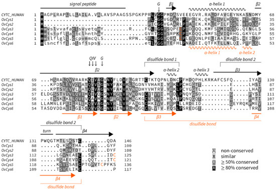 Multiple sequence alignment of OvCys1–6 and human cystatin C. Predicted OvCys3–6 signal peptides are shown in lowercase letters. The signal peptide, secondary structure and two disulfide bonds are indicated at the top, based on the reference human cystatin C (UniProtKB: P01034). Active site residues are indicated by downward arrows. The AlphaFold-predicted structure of OvCys3 (UniProtKB: A0A075AIV5) is shown at the bottom in orange color. Orange-colored cysteines in OvCys3–5 are predicted to form a second disulfide bond.
