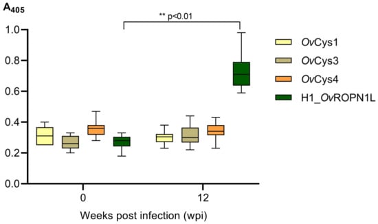 Indirect ELISA results obtained with sera from O. viverrini-infected (12 wpi) and uninfected (0 wpi) hamsters (n = 10, each). The whisker lines indicate the minimum and maximum values. The asterisk (**) represents statistical significance (p < 0.01) as calculated using the Wilcoxon matched-pairs signed-rank test.