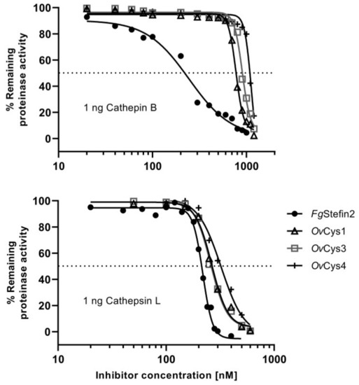Inhibition of bovine cathepsin B and L by recombinant OvCys1, 3, and 4 in comparison with FgStefin2 [12]. The IC50 values are listed in Table 4.