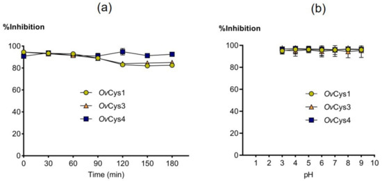 Purified soluble rOvCys1, 3 and 4 were tested for inhibitory activity against bovine cathepsin B and L. FgStefin2 was used as a positive control [12]. OvCys1, 3 and 4 were selected to test inhibition because their native forms were found in soluble CWE and ES products (see Section 3.3). OvCys1, 3 and 4 showed similar inhibition of cathepsin B but were less efficient than FgStefin2 (Figure 4). The IC50 values showed highest inhibition activity for OvCys1, followed by OvCys3 and OvCys4, respectively (Table 4). The inhibition of cathepsin L was similar for OvCys1 and OvCys3 and only slightly lower than for FgStefin2. OvCys4 had slightly lower inhibitory activity, as observed for pH and temperature stability of two F. gigantica cystatins, FgStefin1 and 2 [11,12]. OvCys1, 3 and 4 also showed stability over a wide range of temperatures and pH values (Figure 5).