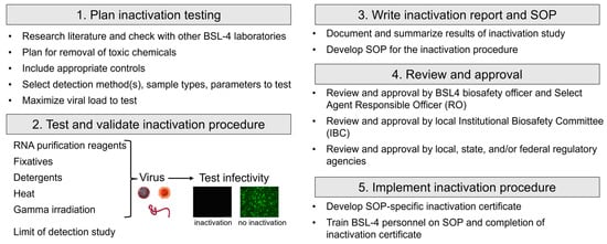 In the sections below, we will provide examples of different inactivation procedures for various BSL-4 viruses, with a focus on potential challenges connected to the specific inactivation procedure. We have developed an inactivation testing rubric that is adaptable to different parameters and viruses tested. The overall scheme of each inactivation testing described in this report can be found in Figures S1–S3.